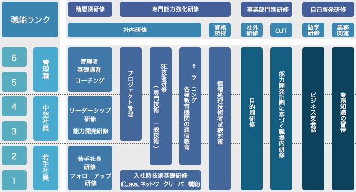当社では、職能ランクに応じて「階層別研修」「専門能力強化研修」「事業部門別研修」「自己啓発研修」を体系付けております。